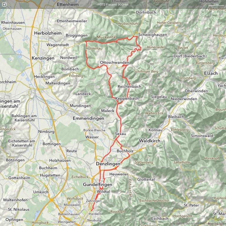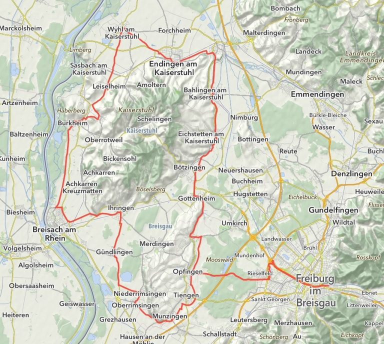 Die Tour startet in Freiburg-Herdern und führt nach Westen in mehrheitlich flaches Terrain und dann doch kurz in den Kaiserstuhl.